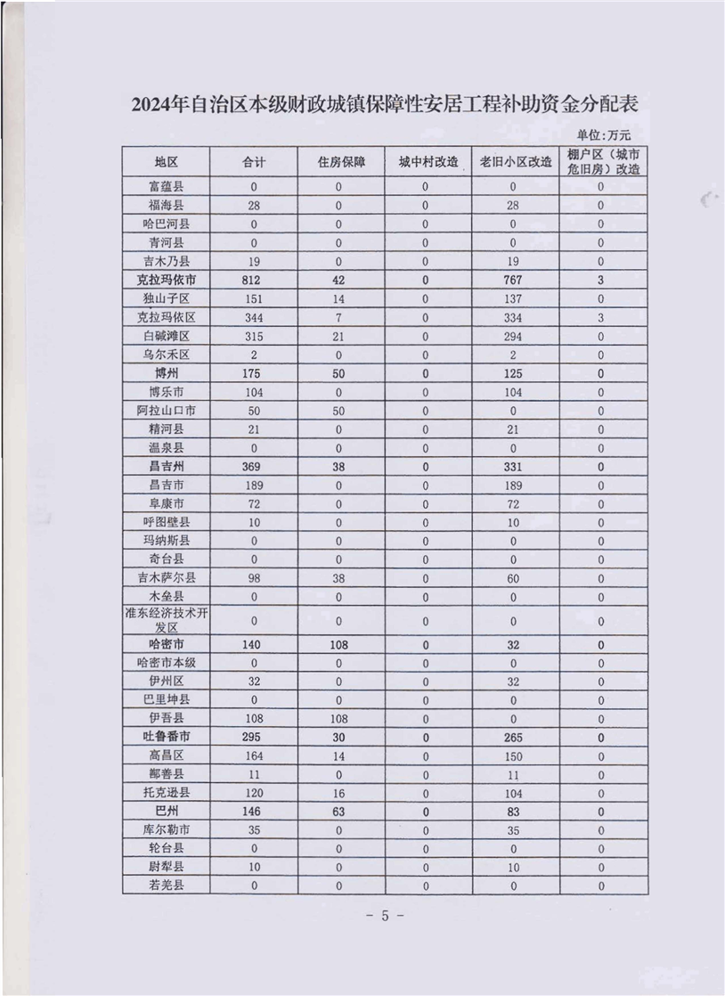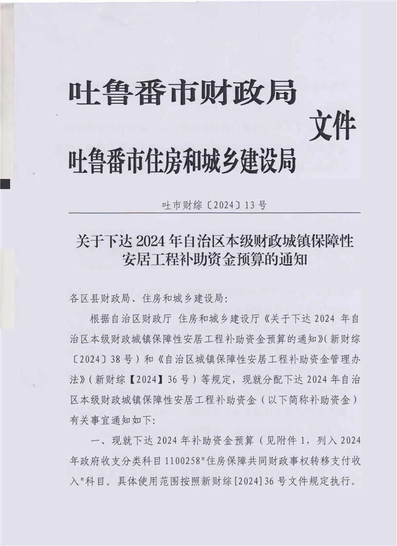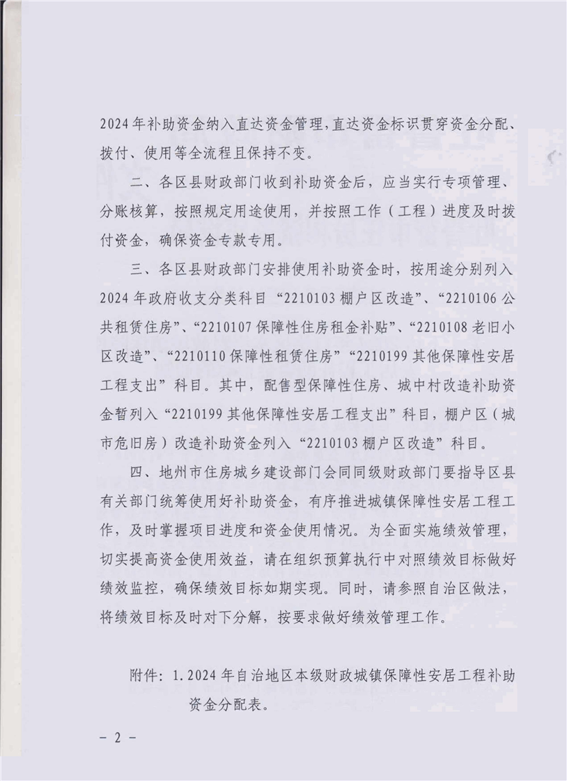关于下达2024年自治区本级财政城镇保障性安居工程补助资金预算的通知