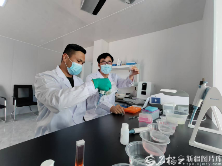 在新疆首个对虾病原分子检测实验室,专家们正在进行虾苗检测。王晓岩摄