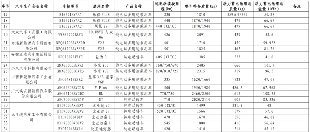 减免车辆购置税的新能源汽车车型目录(第十四批)纯电动汽车