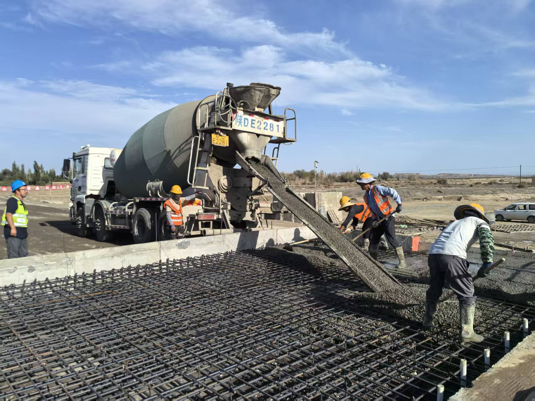 施工现场工人进行混凝土浇筑作业。