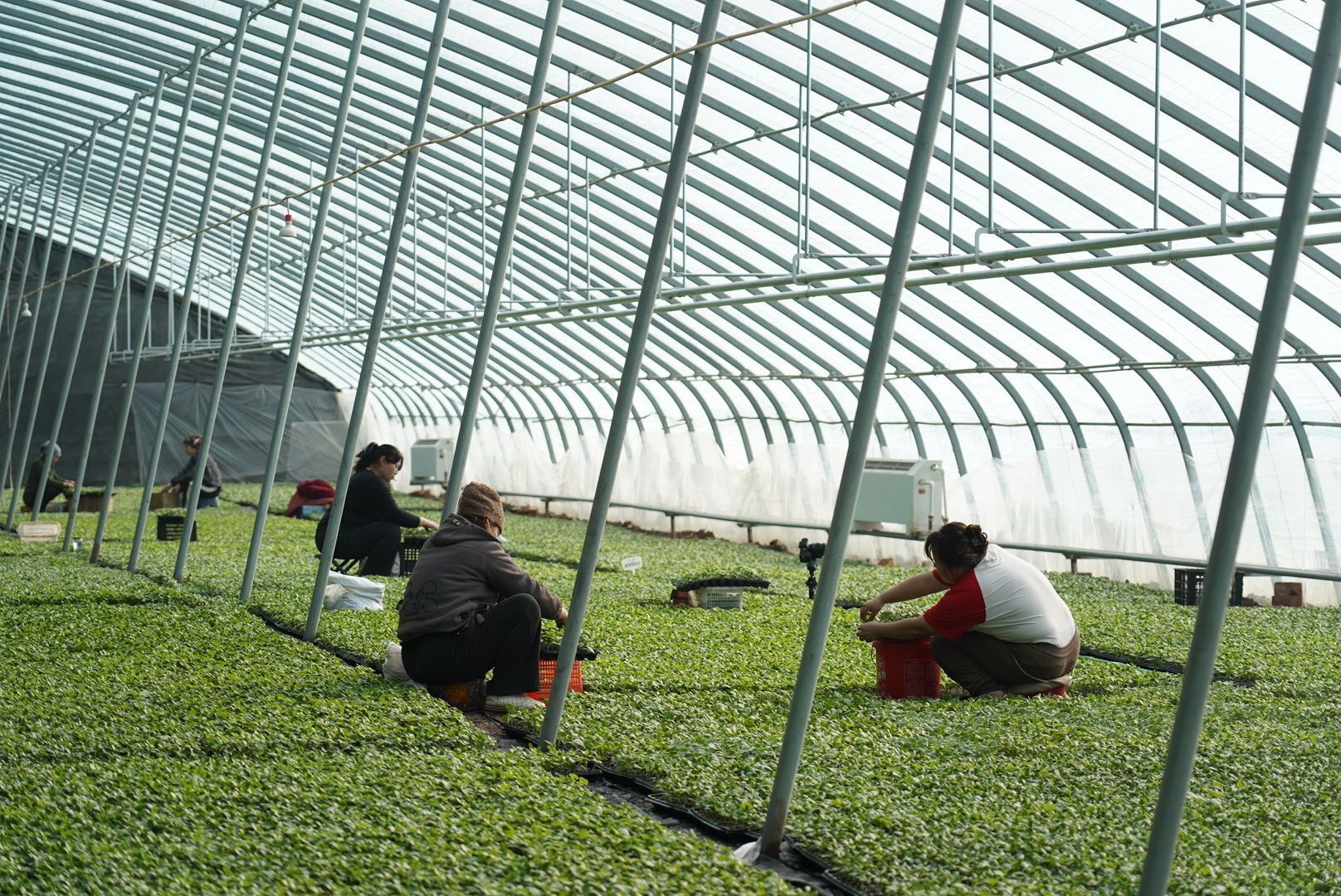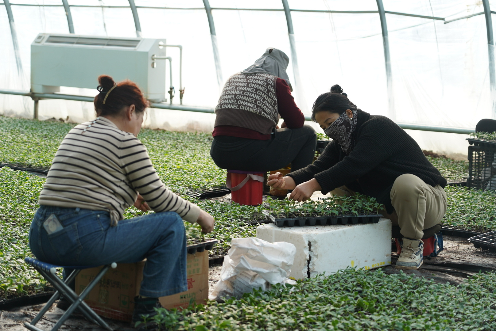 工人们正在为瓜苗掐芽、整苗、嫁接。吐鲁番市融媒体中心记者买迪努尔摄