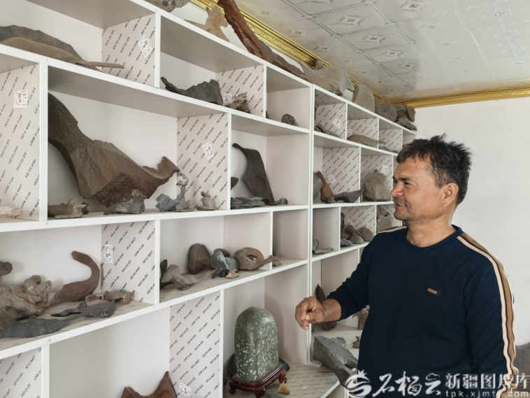 村民玉苏甫·亚库甫,是村里有名的奇石“达人”。他捡石已有20余年,家中摆满了各类珍藏的奇石,虽然家人都在县城居住,但他始终坚守在村里,深耕自己的奇石小产业。“仅靠卖奇石,每年就能增收10多万元。”玉苏甫·亚库甫指着家中一张简陋的桌子说,就是在这张桌子前,疆内乃至北京的知名奇石博主,都曾直播带货他家的奇石。