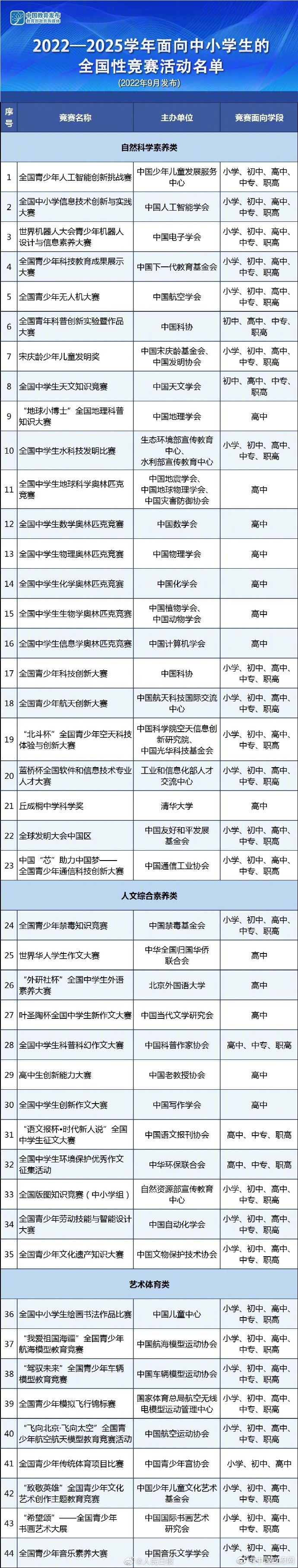 教育部提醒:参加面向中小学生的全国性竞赛活动务必认准教育部门户网站公布的《2022—2025学年面向中小学生的全国性竞赛活动名单》(名单查看下图)。不要参加违规竞赛,谨防上当受骗、遭受损失。