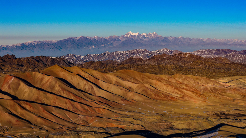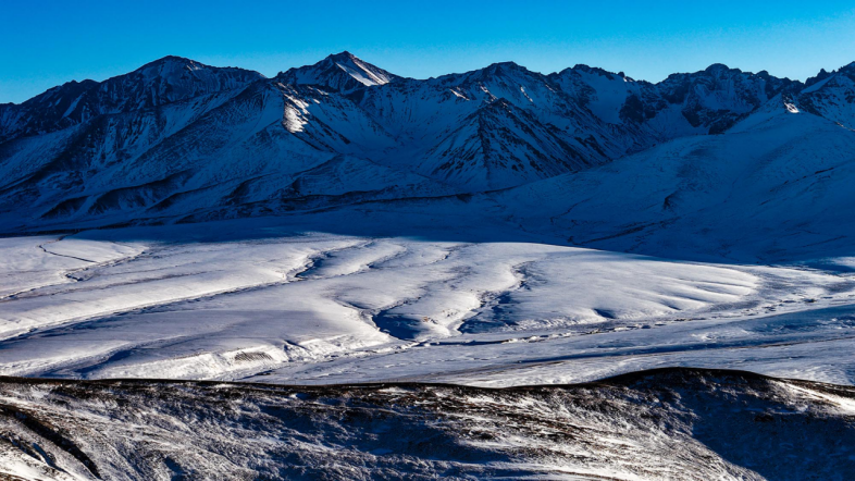 起伏的丘陵和雪山构成一幅冬日画卷。
