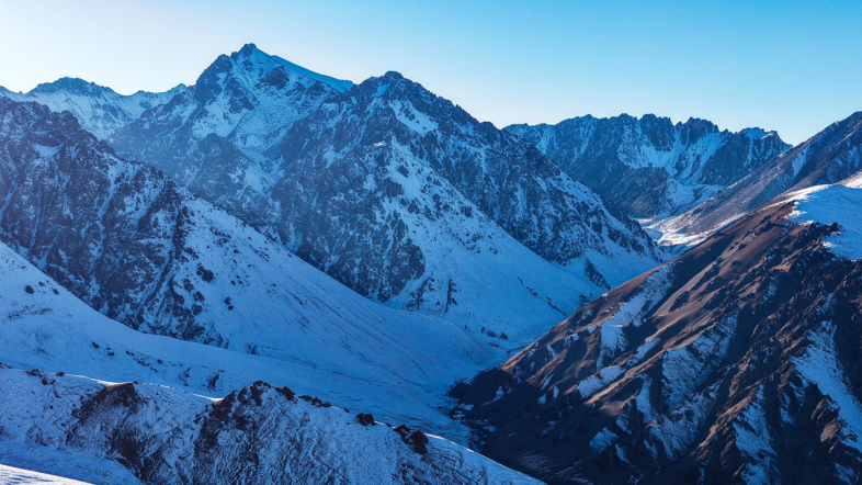 博格达峰巍然矗立,山峰上的积雪与冰川在光线照射下熠熠生辉。
