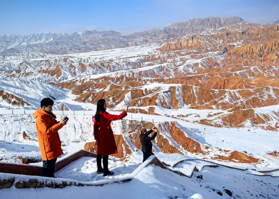 12月25日,在吐鲁番火云谷景区,游客在拍摄欣赏火焰山银装素裹的美景。火焰山横卧于吐鲁番盆地,盛夏酷热似火,冬季披上“银装”的火焰山分外妖娆,景色迷人。吐鲁番市融媒体中心记者刘健刘宇杰摄
