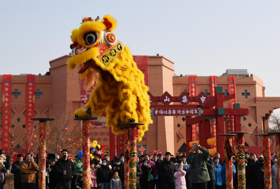 1月31日,“幸福吐鲁番欢乐中国年”2026年货大集火热开市。吐鲁番市高昌区、鄯善县、托克逊县三地联动,共绘一幅热闹欢腾的新春盛景。图为舞狮表演。吐鲁番市融媒体中心记者刘健摄