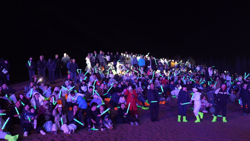 夜幕降临,沉浸式光影与大漠交融,营造出梦幻壮阔之景,宛如科幻秘境,引得现场阵阵欢呼。随后,星空合唱、电音派对轮番上演,营造出浓郁的诗情画意。专业DJ倾情演绎,游客挥舞荧光棒尽情摇摆,释放活力。作为活动压轴环节,璀璨的烟花秀将活动推向高潮。一束束烟花划破漆黑天幕,金色、粉色烟花照亮沙丘,与灯光、星空辉映,不少游客举起手机记录这浪漫瞬间。