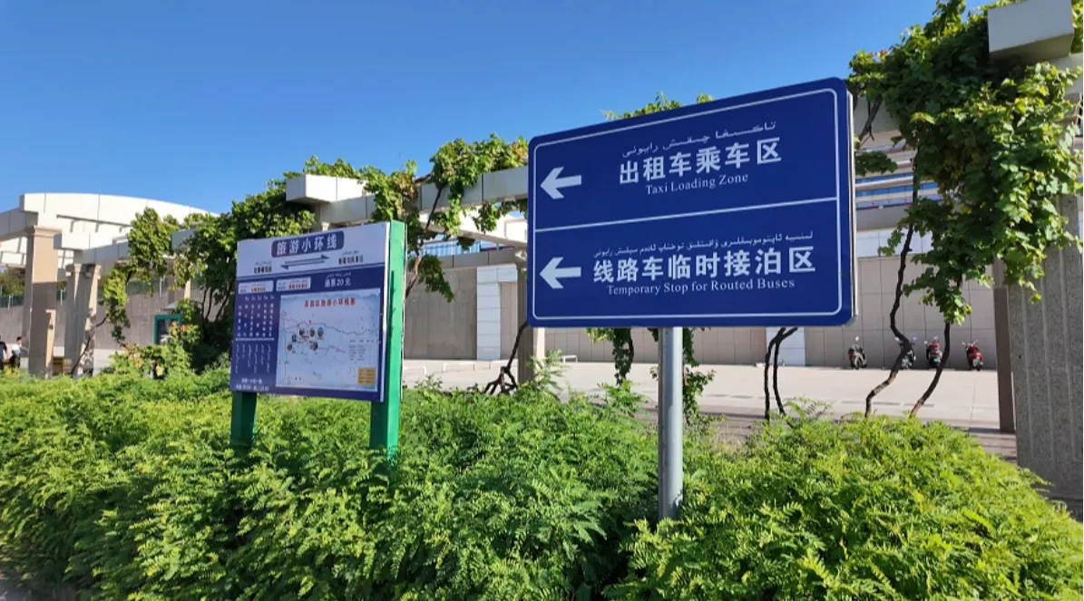 旅游巴士小环线吐鲁番北站站点标识。高昌区融媒体中心记者伍海燕摄