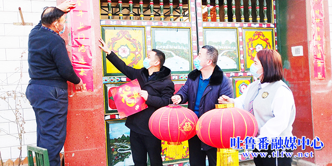 鄯善县辟展镇树柏沟村“访惠聚”工作队队员、村干部和村民一起贴对联、挂灯笼。吐鲁番融媒中心通讯员 肖群花 鲁雪 摄