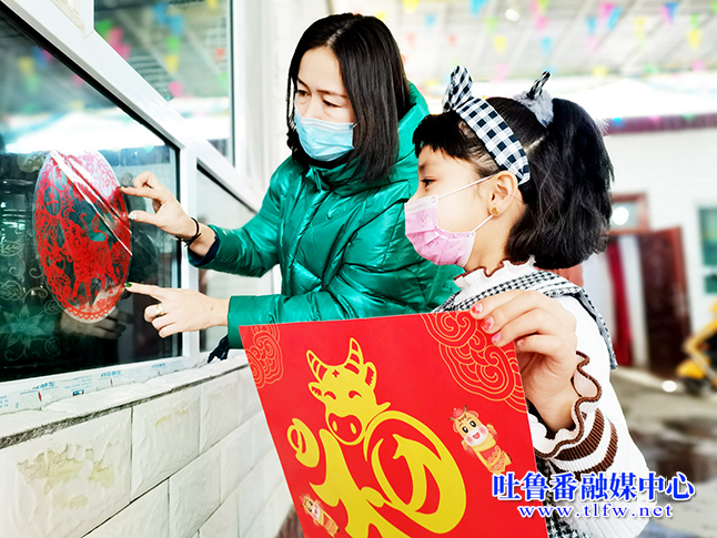 鄯善县辟展镇田园社区干部在村民家与小朋友一起贴窗花。吐鲁番融媒中心通讯员 肖群花 鲁雪 摄